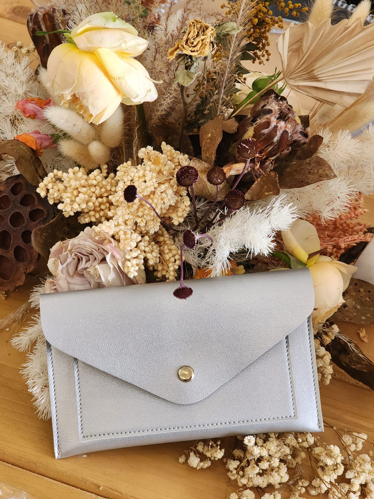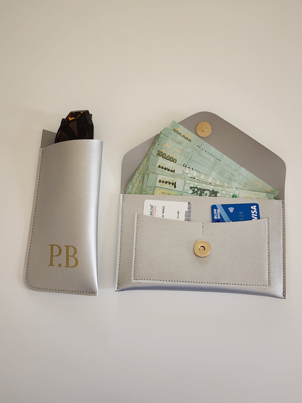 Envelope wallet (19cmx11cm) and Glasses Case (8cmx19cm) with digital initials available in many colors.