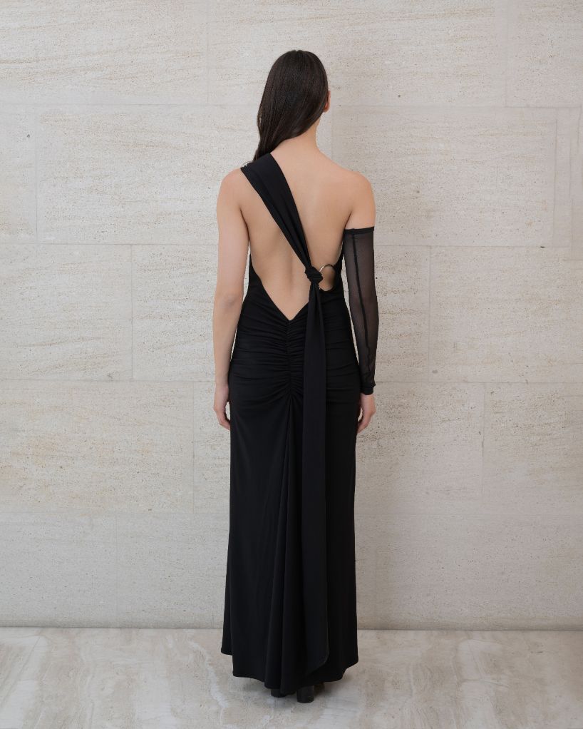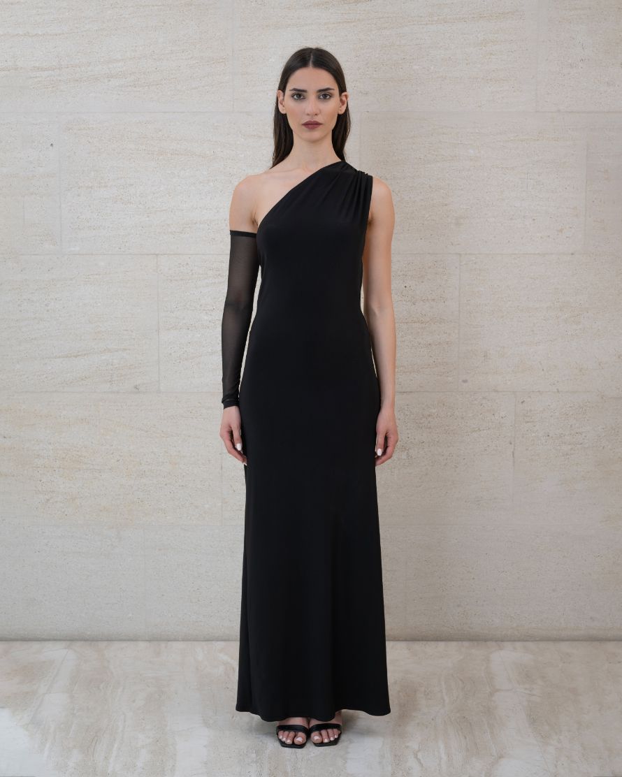 Muse Maxi Dress radiates a sense of elegant simplicity. The one shoulder look allows the silhouette to cling to the figure featuring a tulle glove that gives you a gala look.