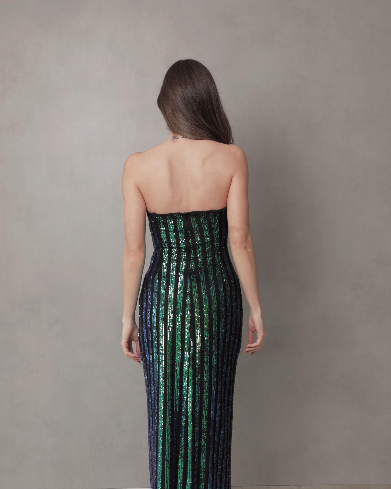 Niamh- Turn heads in this glamourous maxi gown. Coated in green sequined stripes; the strapless design is defined by its form fitting silhouette featuring a back slit and is zipped from the back.